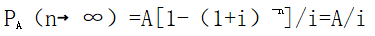 永續(xù)年金現(xiàn)值可以看成是一個n無窮大時(shí)普通年金的現(xiàn)值,永續(xù)年金現(xiàn)值計(jì)算如下: