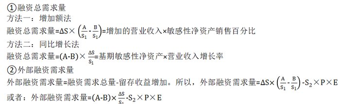假定A為隨銷售而變化的敏感性資產(chǎn);B為隨銷售而變化的敏感性負(fù)債;S1為基期銷售額;S2為預(yù)測期銷售額;ΔS為銷售變動額;P為銷售凈利率;E為利潤留存率;A/S1為敏感性資產(chǎn)與銷售額的關(guān)系百分比;B/S1為敏感性負(fù)債與銷售額的關(guān)系百分比。