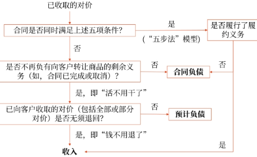 對(duì)于不符合上述條件的合同,企業(yè)只有在不再負(fù)有向客戶(hù)轉(zhuǎn)讓商品的剩余義務(wù),且已向客戶(hù)收取的對(duì)價(jià)無(wú)須退回時(shí),才能將已收取的對(duì)價(jià)確認(rèn)為收入;否則,應(yīng)當(dāng)將已收取的對(duì)價(jià)作為負(fù)債進(jìn)行會(huì)計(jì)處理。