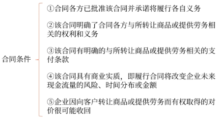 當(dāng)企業(yè)與客戶(hù)之間的合同同時(shí)滿(mǎn)足下列五項(xiàng)條件的,企業(yè)應(yīng)當(dāng)在履行了合同中的履約義務(wù),即在客戶(hù)取得相關(guān)商品控制權(quán)時(shí)確認(rèn)收入(即用“五步法”模型):