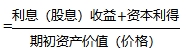 表達方式 | 以金額表示 | 資產(chǎn)的收益額(絕對數(shù))=期限內(nèi)資產(chǎn)現(xiàn)金凈收入(利息、紅利或股息)+資本利得 資本利得是指期末資產(chǎn)的價值(價格)相對于期初價值(價格)的升值 |