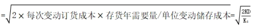 相關(guān)公式 | 存貨年需要量用D來表示,每次訂貨量用Q來表示,每次的變動訂貨成本用K表示,單位變動儲存成本用Kc來表示,最佳經(jīng)濟(jì)訂貨量用EOQ來表示 變動訂貨成本=訂貨次數(shù)×每次變動訂貨成本=D/Q×K 變動儲存成本=平均庫存量×單位變動儲存成本=Q/2×Kc 當(dāng)變動訂貨成本=變動儲存成本時,存貨相關(guān)總成本最小,即:D/Q×K=Q/2×Kc |