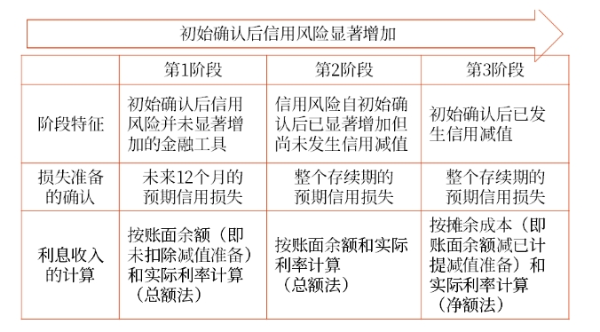 一般情況下,企業(yè)應(yīng)當(dāng)在每個(gè)資產(chǎn)負(fù)債表日評(píng)估相關(guān)金融工具的信用風(fēng)險(xiǎn)自初始確認(rèn)后是否已顯著增加,可以將金融工具發(fā)生信用減值的過程分為三個(gè)階段,并按照下列情形分別計(jì)量其損失準(zhǔn)備、確認(rèn)預(yù)期信用損失及其變動(dòng)。
