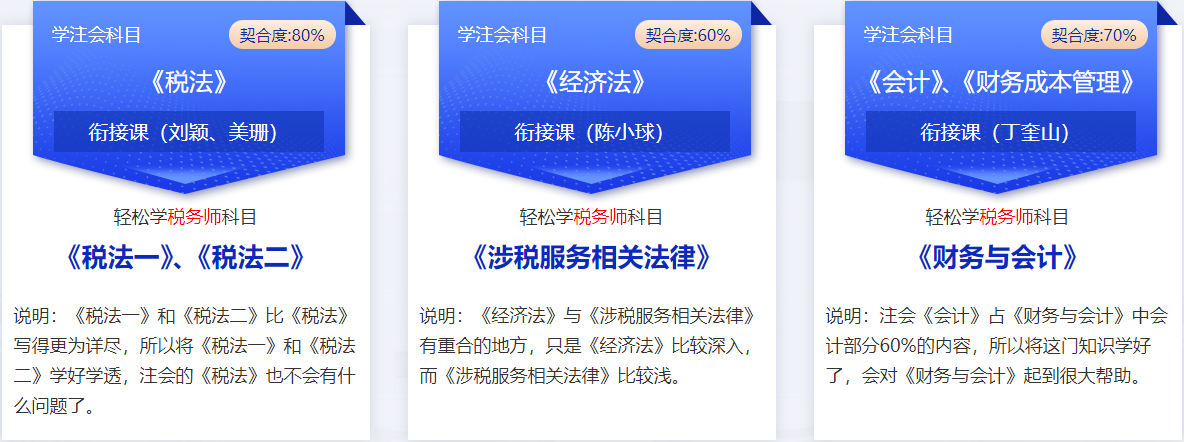 注會(huì)的《經(jīng)濟(jì)法》和稅務(wù)師的《涉稅服務(wù)相關(guān)法律》間的契合度高達(dá)60%;