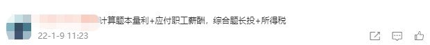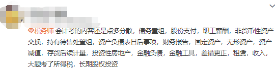 “會(huì)計(jì)考的內(nèi)容還是點(diǎn)多分散,債務(wù)重組,股份支付,職工薪酬,非貨幣性資產(chǎn)交換,持有待售處置組,資產(chǎn)負(fù)債表日后事項(xiàng),財(cái)務(wù)報(bào)告,固定資產(chǎn),無(wú)形資產(chǎn),資產(chǎn)減值,存貨后續(xù)計(jì)量,投資性房地產(chǎn),金融負(fù)債,金融工具,差錯(cuò)更正,租賃,收入,大題考了所得稅,長(zhǎng)期股權(quán)投資”