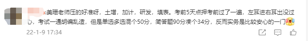 “美珊老師壓的好準呀,土增,加計,研發(fā),填表??记?天點押考前過了一遍,左耳進右耳出沒過心,考試一通胡編亂造,但是單選多選混個50分,簡答題90分湊個34分,反而實務是比較安心的一門”