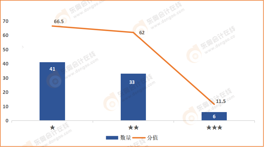 其中一星難度考題的數(shù)量最多,共計(jì)41道,所占分值為66.5分。其次是二星難度,題目數(shù)量與一星難度的題目數(shù)量相比較少,共計(jì)33道,所占分值為62分。三星考題數(shù)量最少,僅有6道,分值為11.5分。