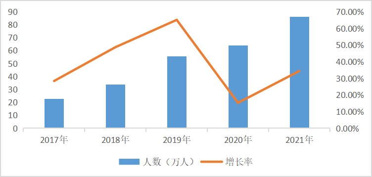 從上圖的數(shù)據(jù)表中我們可以看見,稅務(wù)師考試報名人數(shù)增長迅速。從2017年的剛過20萬人,到2021年的86萬余人,僅用了5年時間。其中由于疫情等原因的影響,2020年稅務(wù)師考試報名人數(shù)漲幅下降,但在2021年又開始重新回升,報名人數(shù)挺入80萬大關(guān)!