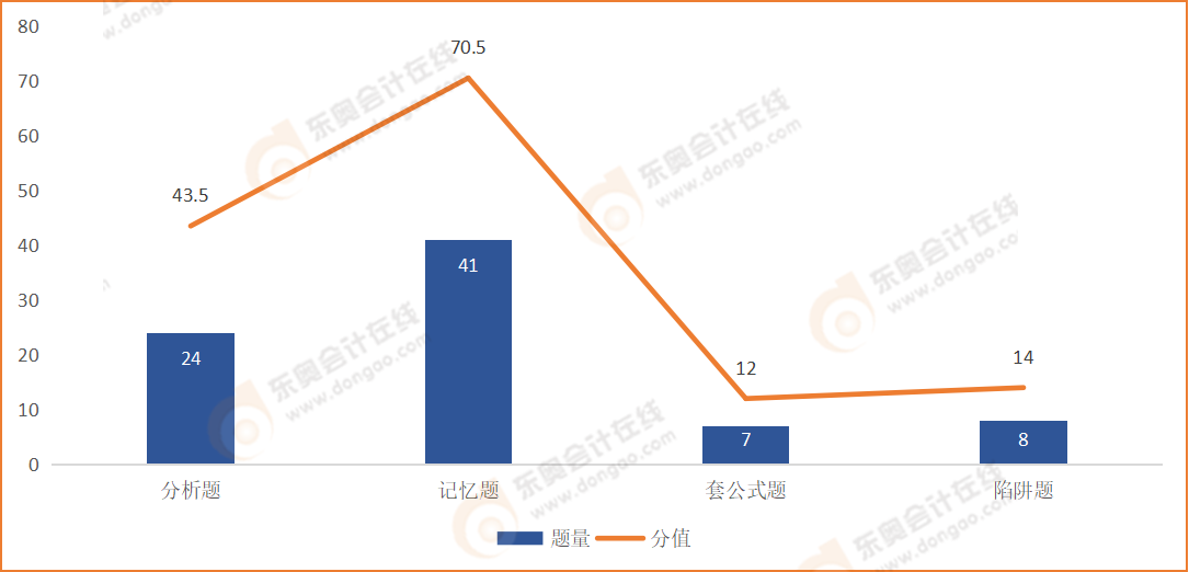 本次稅法二科目考試的記憶型考題共有41道,所占分值為70.5分。與記憶型考題相比,分析型考題數(shù)量相對(duì)較少,但也達(dá)到了24道,所占分值為43.5分。套公式型考題和陷阱型考題考查最少,分別僅考查7道和8道。