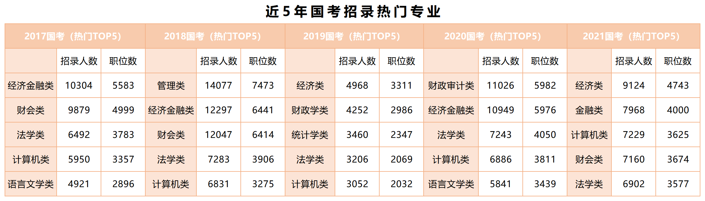 縱觀近5年的公考各專業(yè)崗位招錄人數(shù),不難發(fā)現(xiàn)財會、經(jīng)濟(jì)金融類專業(yè)頻頻進(jìn)入前五,已經(jīng)成為招錄的熱門專業(yè)。