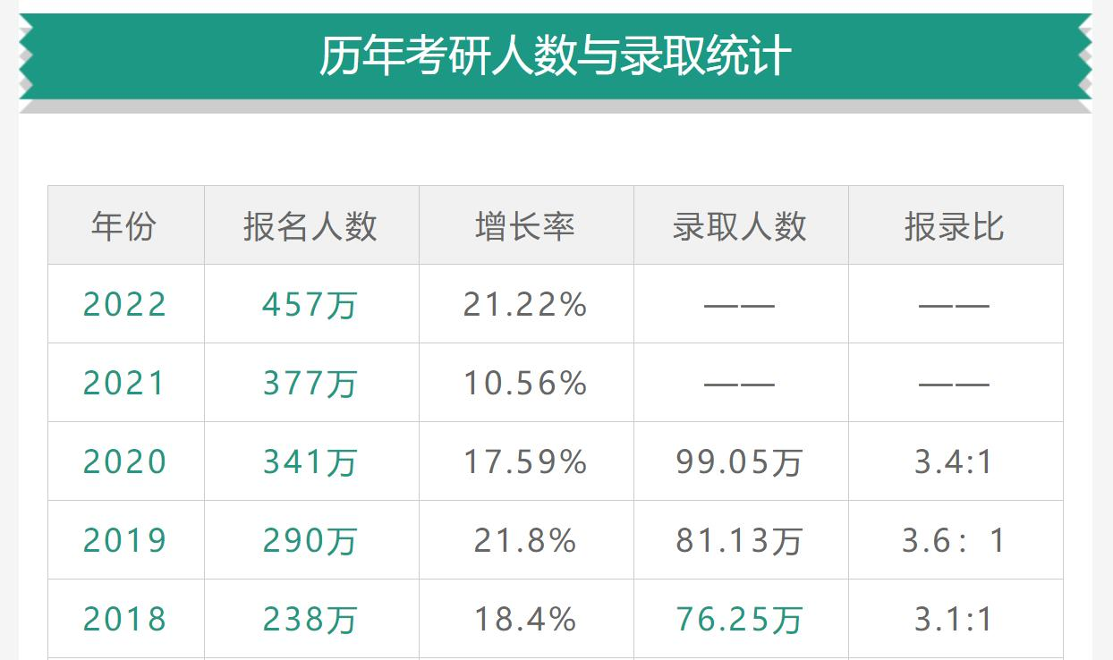 可以看到,考研大軍每年保持兩位數(shù)的增速,從2018年的238萬人,到2022年的457萬人,僅用了5年時(shí)間,報(bào)名人數(shù)已經(jīng)實(shí)現(xiàn)了超90%的增長率。