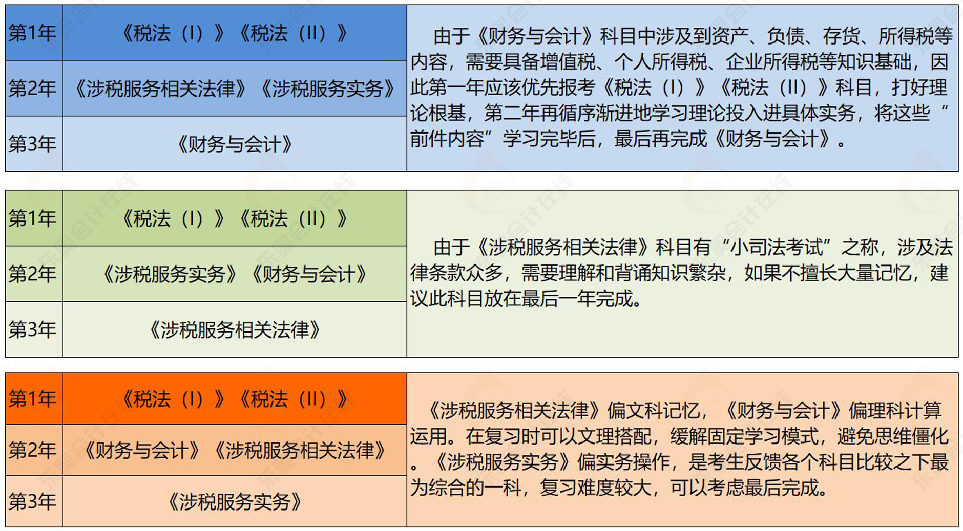 稅務(wù)師各科目雖緊密聯(lián)系,但側(cè)重點(diǎn)各有不同,如果已經(jīng)做好了自身的職業(yè)規(guī)劃,那就可以根據(jù)科目特點(diǎn),第一年先選報(bào)滿足你職業(yè)需要的科目。