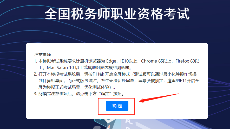 請各位稅務(wù)師考生仔細閱讀“注意事項”,然后點擊“確定”。