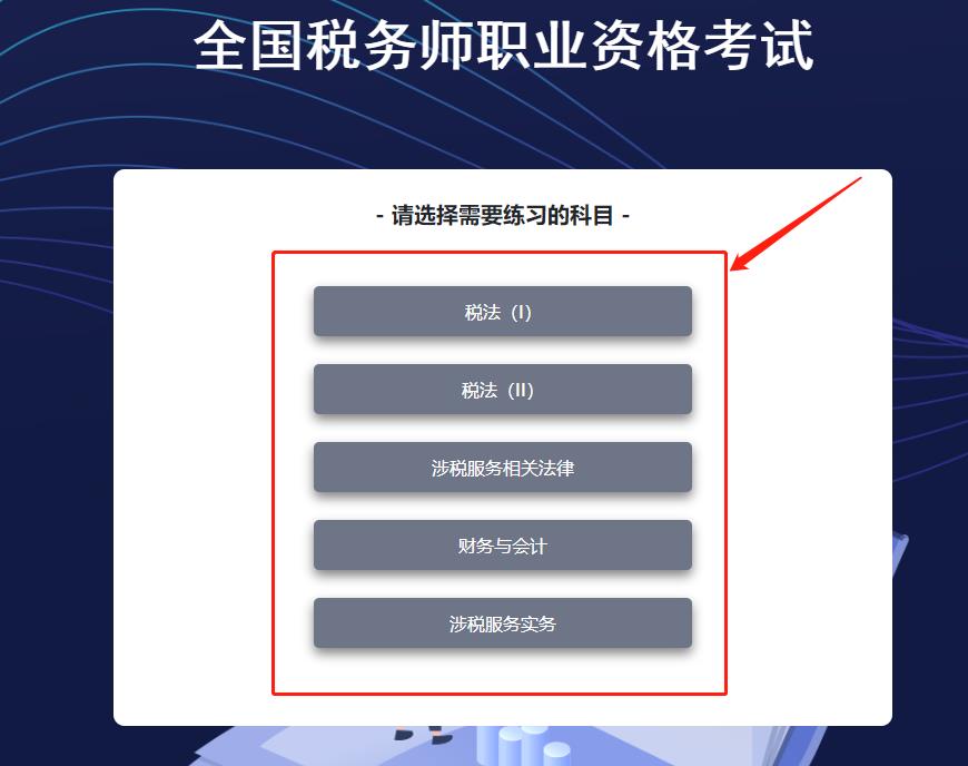 選擇需要練習(xí)的稅務(wù)師考試科目。(注:由于此系統(tǒng)為稅務(wù)師機考模擬系統(tǒng),因此到正式考試時,各位考生需要根據(jù)自己報考的稅務(wù)師科目,謹慎選擇。)