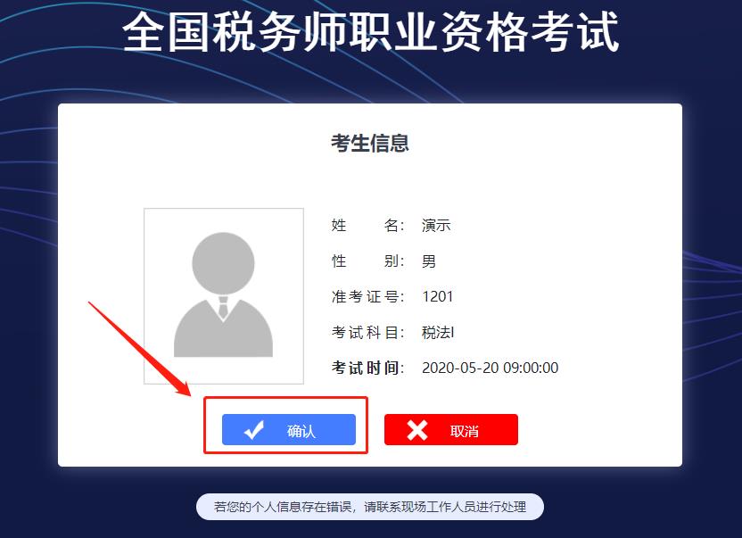 確認考生信息,若考生個人信息無誤,則可以點擊“確認”,進入下一步。(注:下文所示為機考模擬系統(tǒng)測試信息,請各位考生以自己實際個人信息為準,下方信息為模擬信息,僅供參考。)