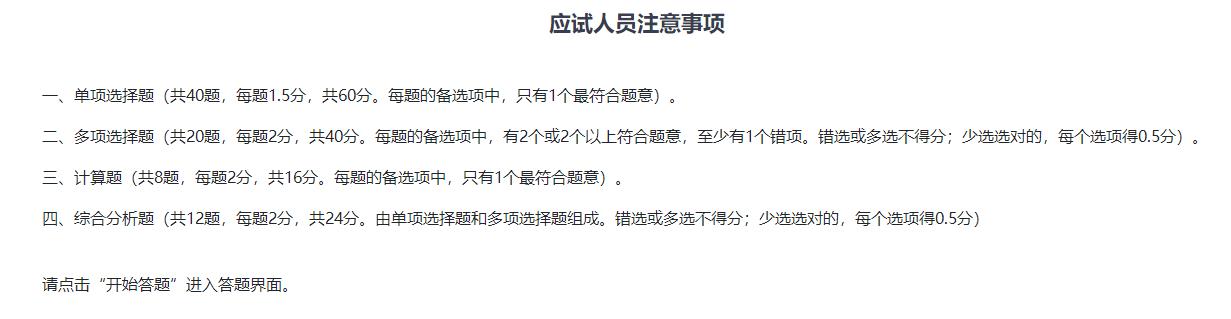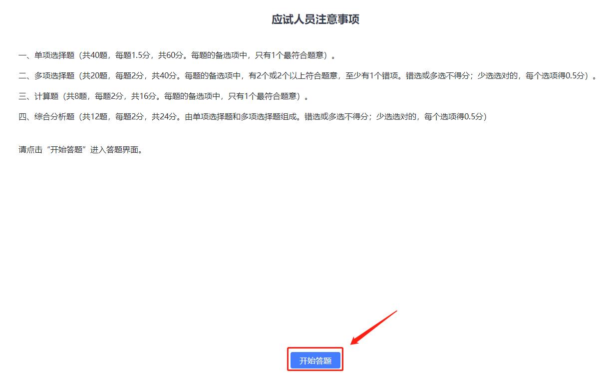 進入答題頁面后,考生須仔細閱讀“應(yīng)試人員注意事項”,然后點擊“開始答題”。