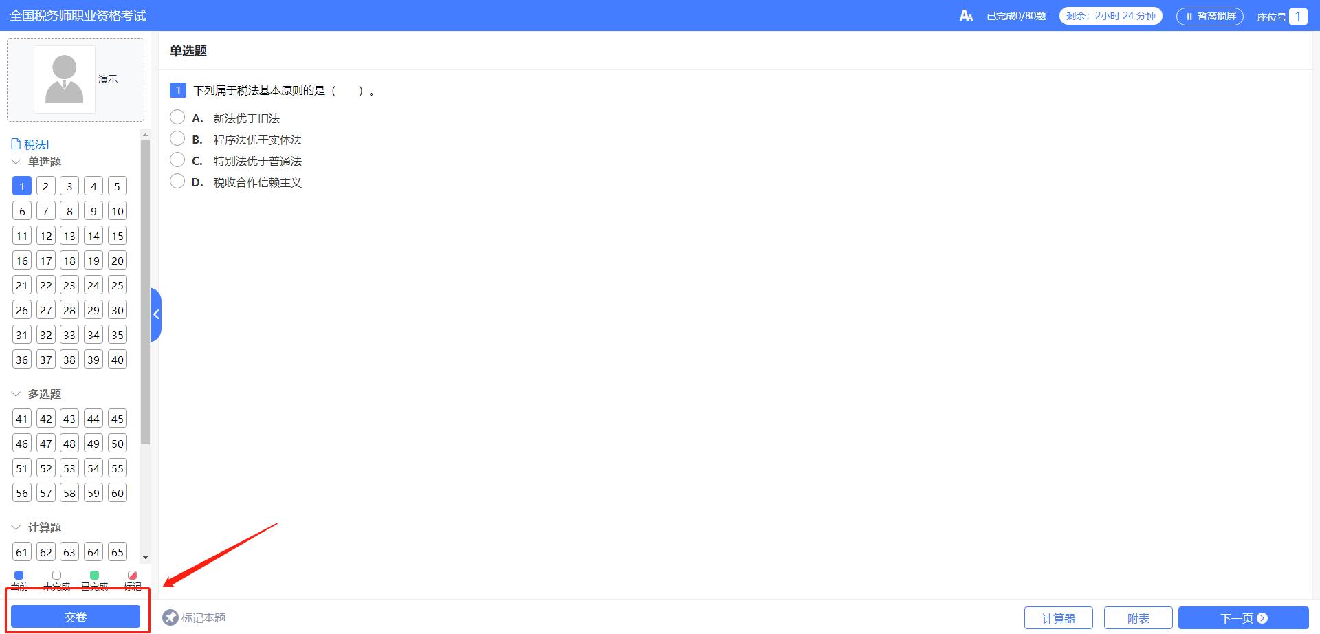 底部工具欄區(qū)從左到右依次為標記本題、計算器、附表以及翻頁。