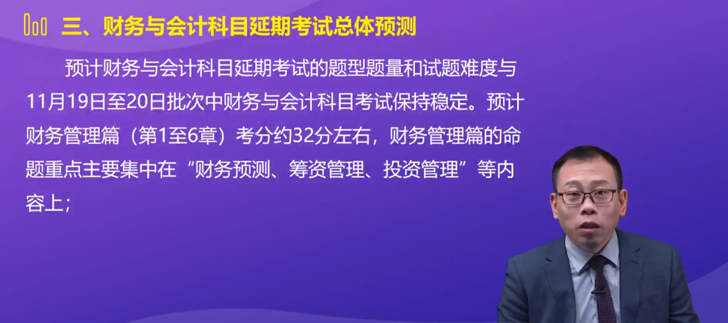 李運河老師預計本次稅務師考試延考《財務與會計》科目的題型題量及考試難度與正式批次的考試保持穩(wěn)定,預計財務篇考試分值為32分左右,命題重點主要集中在“財務預測、籌資管理與投資管理”的內(nèi)容上。下文為具體詳情: