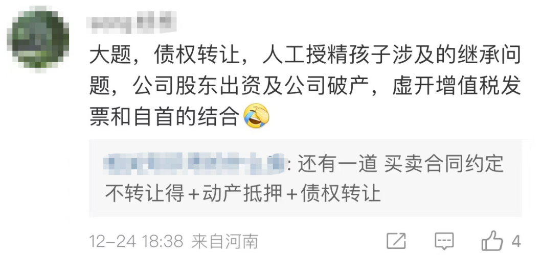 根據(jù)考生們的反饋,2022稅務(wù)師延考《涉稅服務(wù)相關(guān)法律》科目大概涉及到保證合同、債權(quán)轉(zhuǎn)讓、繼承法、公司股東出資及公司破產(chǎn)、虛開(kāi)增值稅發(fā)票和自首的結(jié)合等知識(shí)點(diǎn)。
