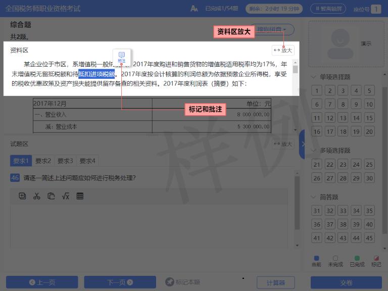 (7)考生對資料區(qū)使用標(biāo)注功能,不會被作為答題結(jié)果,也不會影響考生得分情況。