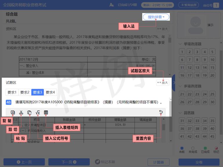 3)主觀題的資料區(qū)以及試題區(qū)的工具欄使用方法可以參考答題輔助功能使用說明。此外,為方便考生作答,答題時(shí)使用鍵盤直接輸入數(shù)字或符號,以及使用快捷鍵功能,系統(tǒng)都可接受,作答結(jié)果不受影響。