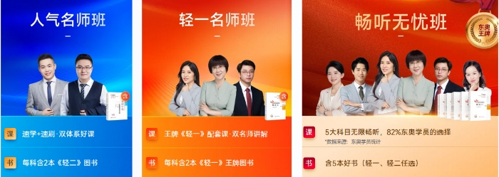 ■輕一名師班:單科首選,每一科都有兩位東奧名師授課,輕一作者+人氣名師,共計14位名師授課,搭配的《輕一》圖書,是一套高效、精煉課程。