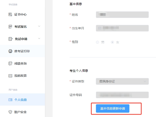 如“姓名、證件類(lèi)型、證件號(hào)碼”填寫(xiě)錯(cuò)誤或需要變更,可以登錄考試報(bào)名網(wǎng)站后點(diǎn)擊“網(wǎng)上報(bào)名”>"個(gè)人信息">“基本信息更新申請(qǐng)”填寫(xiě)并上傳相關(guān)證明,確認(rèn)無(wú)誤后點(diǎn)擊“提交”,等待審核結(jié)果。