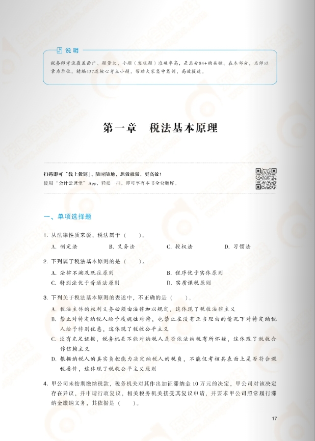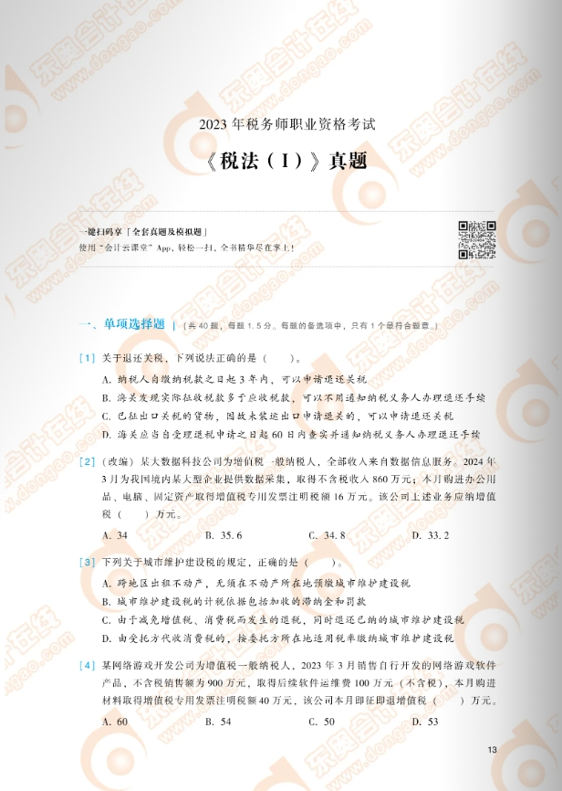 歷年稅務(wù)師考試的考題,因其高度貼近實(shí)際的考試考查思路和難度,對(duì)于準(zhǔn)備參加稅務(wù)師考試的考生而言,具有極高的參考價(jià)值。通過(guò)仔細(xì)研究和解答這些考題,考生們可以洞察到考試的出題規(guī)律,從而更加精準(zhǔn)地把握備考方向。