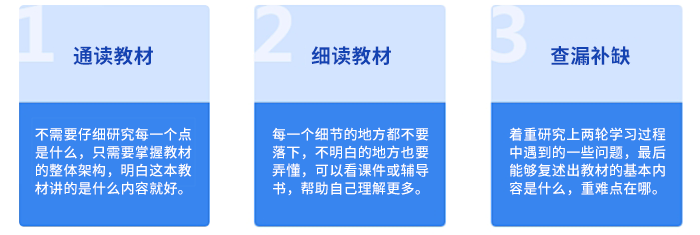 預(yù)習(xí)階段時間充裕,盡管只能依賴舊教材,但這也是實現(xiàn)從零到一突破的最佳時機。建議考生們分三步走: