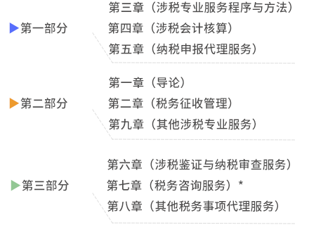 第七章 涉稅專業(yè)服務(wù)業(yè)務(wù) | 第一章 全部內(nèi)容 第三章 “一、涉稅專業(yè)服務(wù)基本程序” “六、社會保險費審核方法” 第六章 “一、涉稅鑒證業(yè)務(wù)概述” “七、稅務(wù)司法鑒定服務(wù)” “八、納稅情況審查服務(wù)” 第七章 稅務(wù)咨詢服務(wù) 第八章 “六、社會保險費申報代理” |