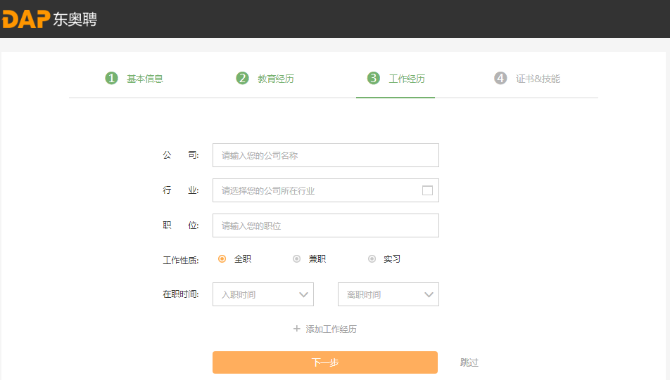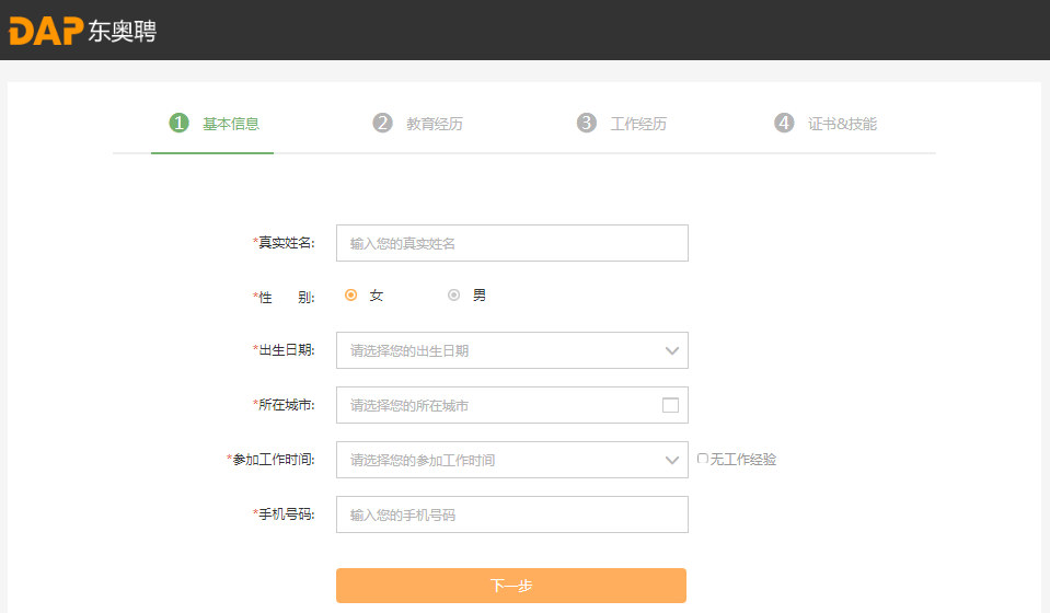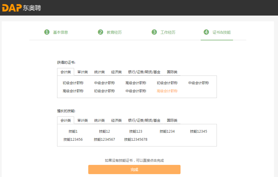 1基本信息 —> 2教育經(jīng)歷—3工作經(jīng)歷—>4證書技能—>完成