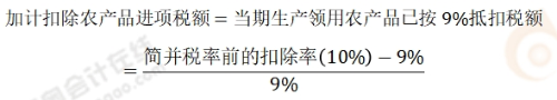 ②在生產(chǎn)領(lǐng)用當期按簡并稅率前的扣除率(10%)與9%之間的差額計算當期可加計扣除的農(nóng)產(chǎn)品進項稅額: