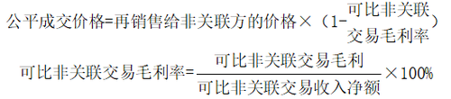 (1)再銷售價格法以關(guān)聯(lián)方購進商品再銷售給非關(guān)聯(lián)方的價格減去可比非關(guān)聯(lián)交易毛利后的金額作為關(guān)聯(lián)方購進商品的公平成交價格。其計算公式為: