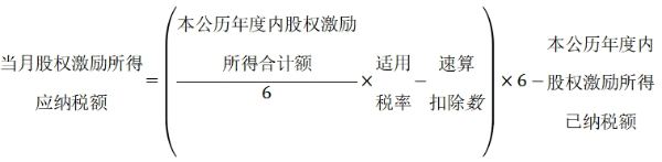 (3)非居民個(gè)人一個(gè)月內(nèi)取得股權(quán)激勵(lì)所得,單獨(dú)按照規(guī)定計(jì)算當(dāng)月收入額,不與當(dāng)月其他工資薪金合并,按6個(gè)月分?jǐn)傆?jì)稅(一個(gè)公歷年度內(nèi)的股權(quán)激勵(lì)所得應(yīng)合并計(jì)算),不減除費(fèi)用,適用月度稅率表計(jì)算應(yīng)納稅額,計(jì)算公式如下(公式六):