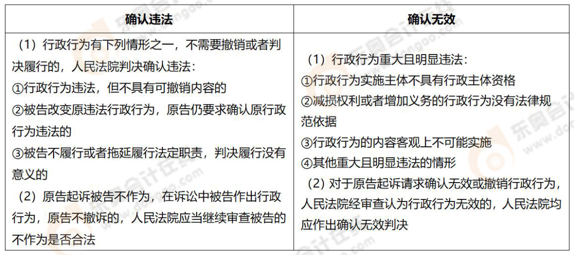 記憶背誦:確認(rèn)無效是針對重大且明顯違法的事項(xiàng),對原告的權(quán)益產(chǎn)生了實(shí)質(zhì)性損害;而判決確認(rèn)違法主要針對的是行政行為無法撤銷或者判決履行無意義的情況