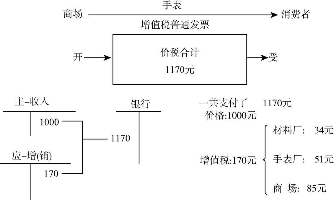 提示:以手表這個商品為例,講述各個流轉(zhuǎn)環(huán)節(jié)產(chǎn)生的增值稅,便于考生理解增值稅的來龍去脈。