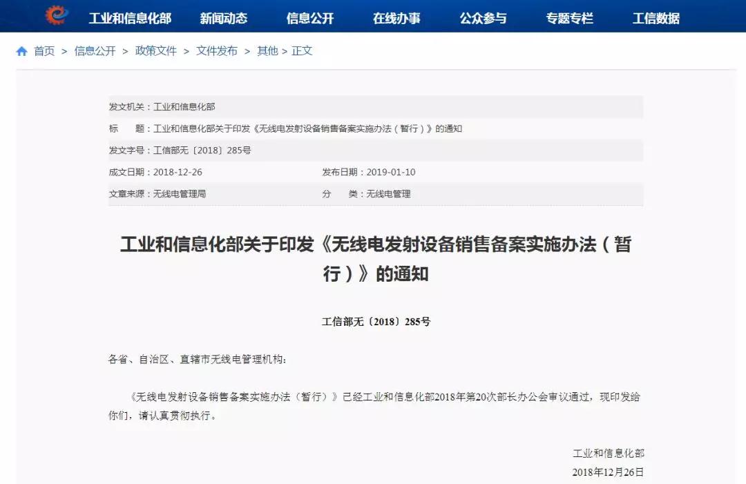 工信部發(fā)布《無(wú)線電發(fā)射設(shè)備銷售備案實(shí)施辦法(暫行)》,自3月1日起施行?!掇k法》共十五條,明確了實(shí)施銷售備案的依據(jù)和適用范圍、管理機(jī)構(gòu)、備案主體、備案內(nèi)容、操作流程等內(nèi)容,提出建立全國(guó)統(tǒng)一的無(wú)線電發(fā)射設(shè)備銷售備案信息平臺(tái),并規(guī)定了監(jiān)督檢查要求。