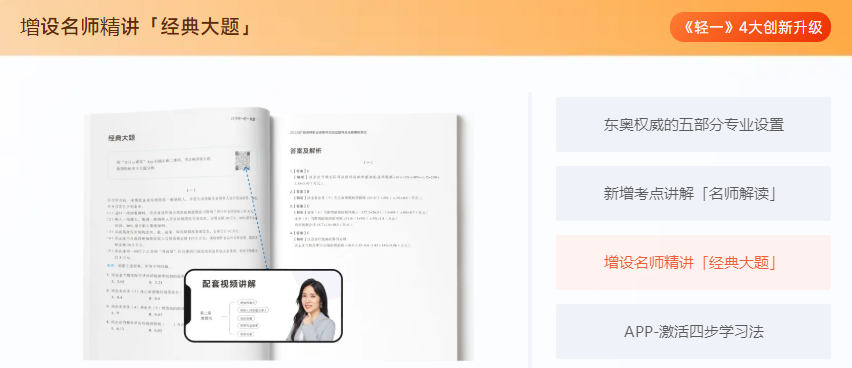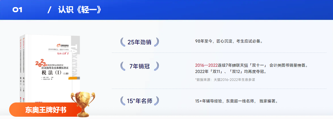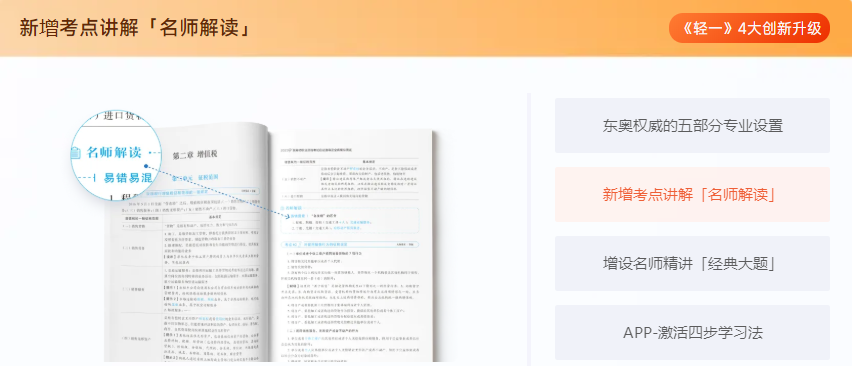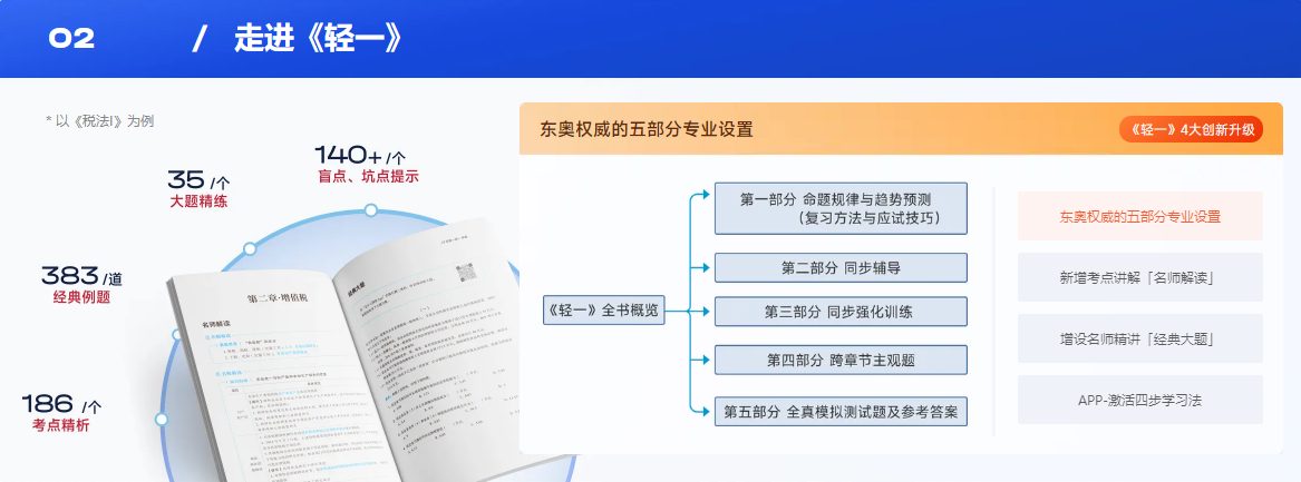 以《稅法一》為例,《輕一》中共含有186個考點精析、383個經(jīng)典例題、35個大題精練、140+個盲點、坑點提示。更有東奧引以為傲的五部分專業(yè)設置等超多升級,幫助考生更好的進行備考。>>>點擊了解輕松過關系列圖書<<<