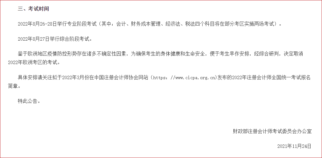 打算報(bào)考2022年注冊(cè)會(huì)計(jì)師考試的小伙伴們注意啦!2022年注冊(cè)會(huì)計(jì)師報(bào)名簡章尚未公布,但是,中注協(xié)已經(jīng)官宣了2022年注冊(cè)會(huì)計(jì)師報(bào)名時(shí)間、交費(fèi)時(shí)間及考試時(shí)間,同時(shí)表示擬于2022年3月在中國注冊(cè)會(huì)計(jì)師協(xié)會(huì)官網(wǎng)發(fā)布2022年注冊(cè)會(huì)計(jì)師報(bào)名簡章。