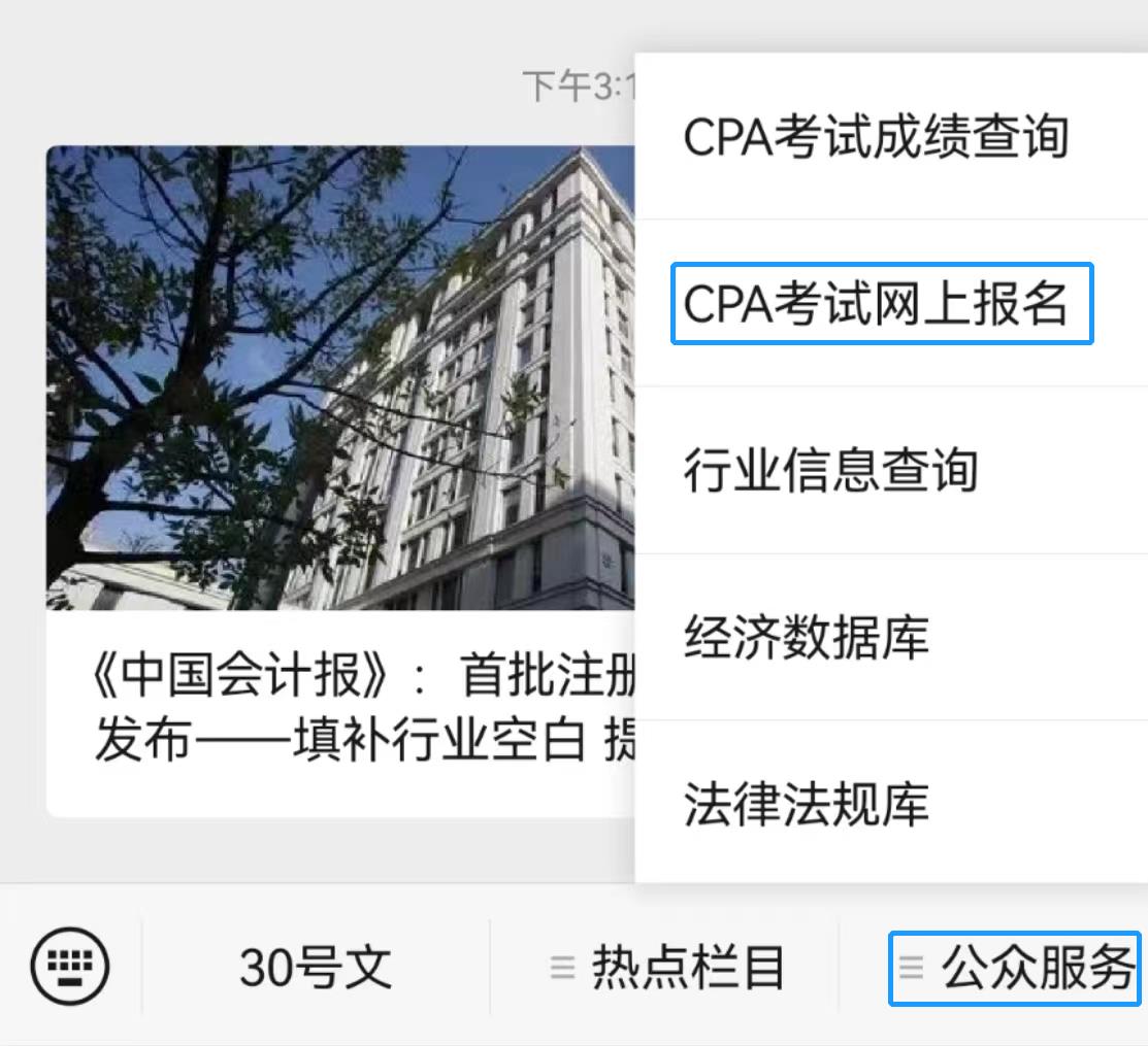 第一步:關注中注協(xié)官方微信公眾號“中國注冊會計師協(xié)會”,點擊“公眾服務”,選擇“CPA考試網上報名”