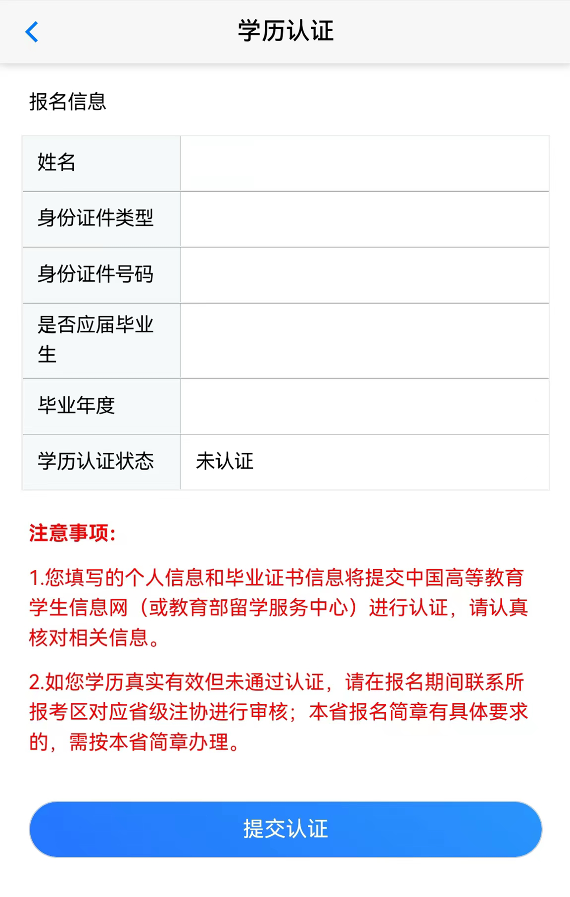 首次報名人員的學歷信息認證,原則上由網報系統(tǒng)根據身份證件信息鏈接“中國高等教育學生信息網”進行。持國(境)外學歷的報名人員(含港澳臺居民居住證持有人)填報的教育部留學服務中心出具的學歷認證書編號,由中注協(xié)、省級注協(xié)提交教育部留學服務中心進行認證。