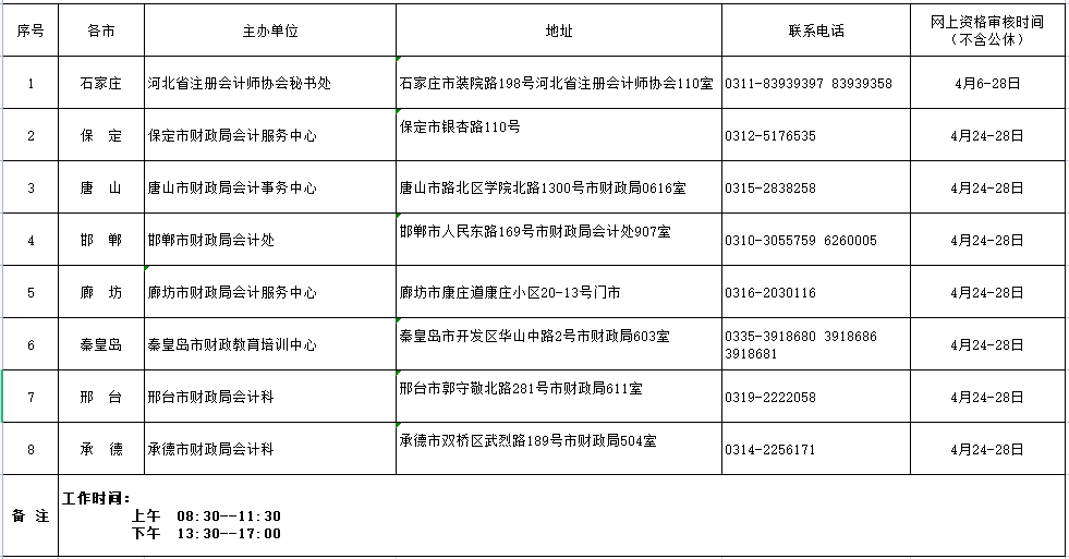 郴州 | 郴州市注冊(cè)會(huì)計(jì)師協(xié)會(huì) | 郴州市惠澤路38號(hào),市財(cái)政局一樓會(huì)計(jì)與信息科103辦公室 | 4月17-21日( 8:30-12:00,14:00-17:00) | 0735-2371007 4913877@qq.com |