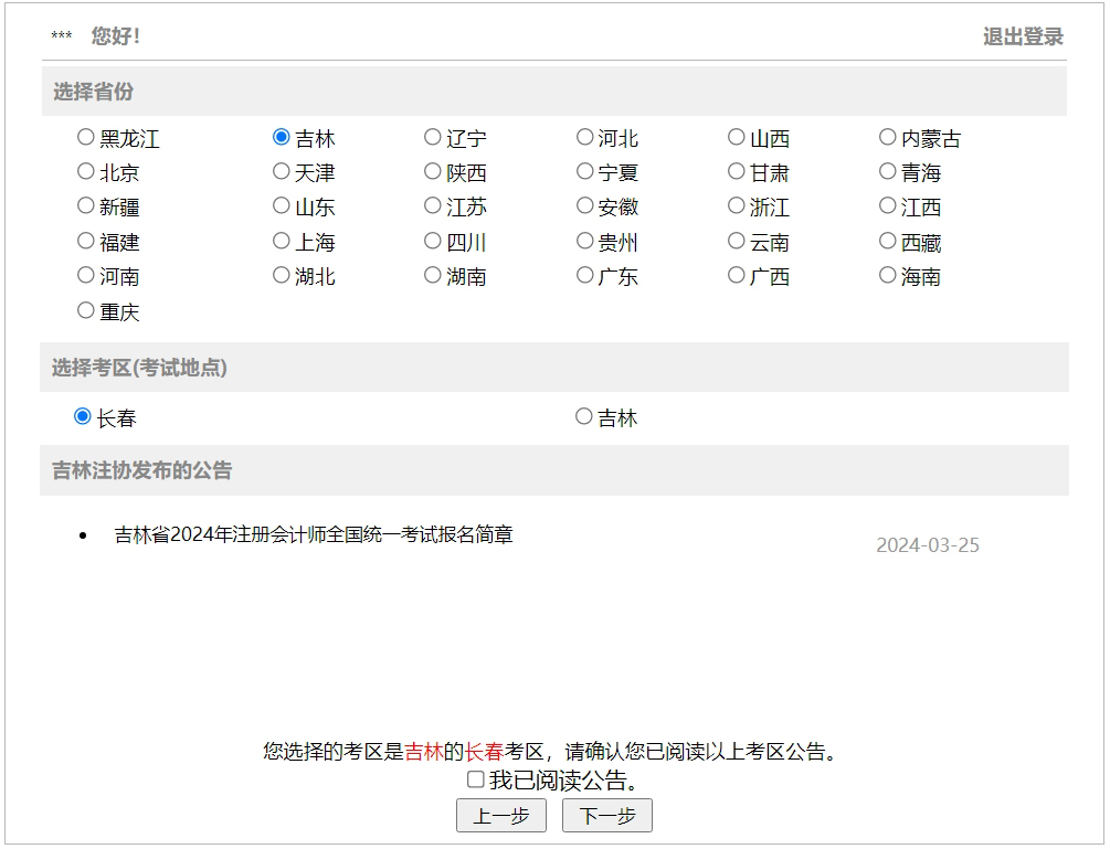 選擇報(bào)考省份及報(bào)考城市,認(rèn)真閱讀該地區(qū)注協(xié)發(fā)布的公告,并勾選“我已閱讀公告”,進(jìn)入下一步操作。