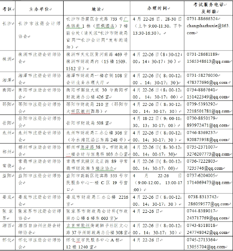 1 | 石家莊 | 河北省注冊(cè)會(huì)計(jì)師協(xié)會(huì)秘書處 | 石家莊市裝院路198號(hào)河北省注冊(cè)會(huì)計(jì)師協(xié)會(huì)110室 | 0311-83939397 83939369 | 4月8日至30日 |