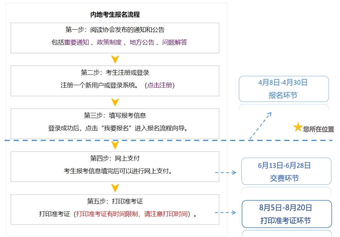 注會考試報(bào)名流程自2021年將報(bào)名與交費(fèi)分開之后??忌鷤冃枰植酵瓿煽荚噲?bào)考流程。2024年4月8日-4月30日期間,考生們須要完成的是下圖中橫虛線以上的操作部分。當(dāng)整體完成“報(bào)名”后,如果報(bào)名狀態(tài)審核完畢,考生將處于圖中標(biāo)星的位置處,此時(shí)就可以放心去投入學(xué)習(xí),等待6月13日開始的注會交費(fèi)環(huán)節(jié)了。