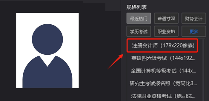 第二步:點(diǎn)擊“報(bào)名照”功能,在規(guī)格列表中找到“注冊(cè)會(huì)計(jì)師(178*220像素)”選項(xiàng)。