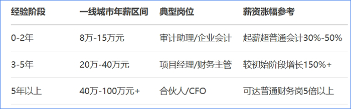 一線城市資深從業(yè)者年薪普遍突破40萬元,四大會計(jì)師事務(wù)所合伙人年薪超百萬,投行、券商等金融機(jī)構(gòu)的財(cái)務(wù)高管年薪可達(dá)80萬至150萬元。即便在二三線城市,持證人薪資也顯著高于普通會計(jì)崗位,且晉升速度更快。
