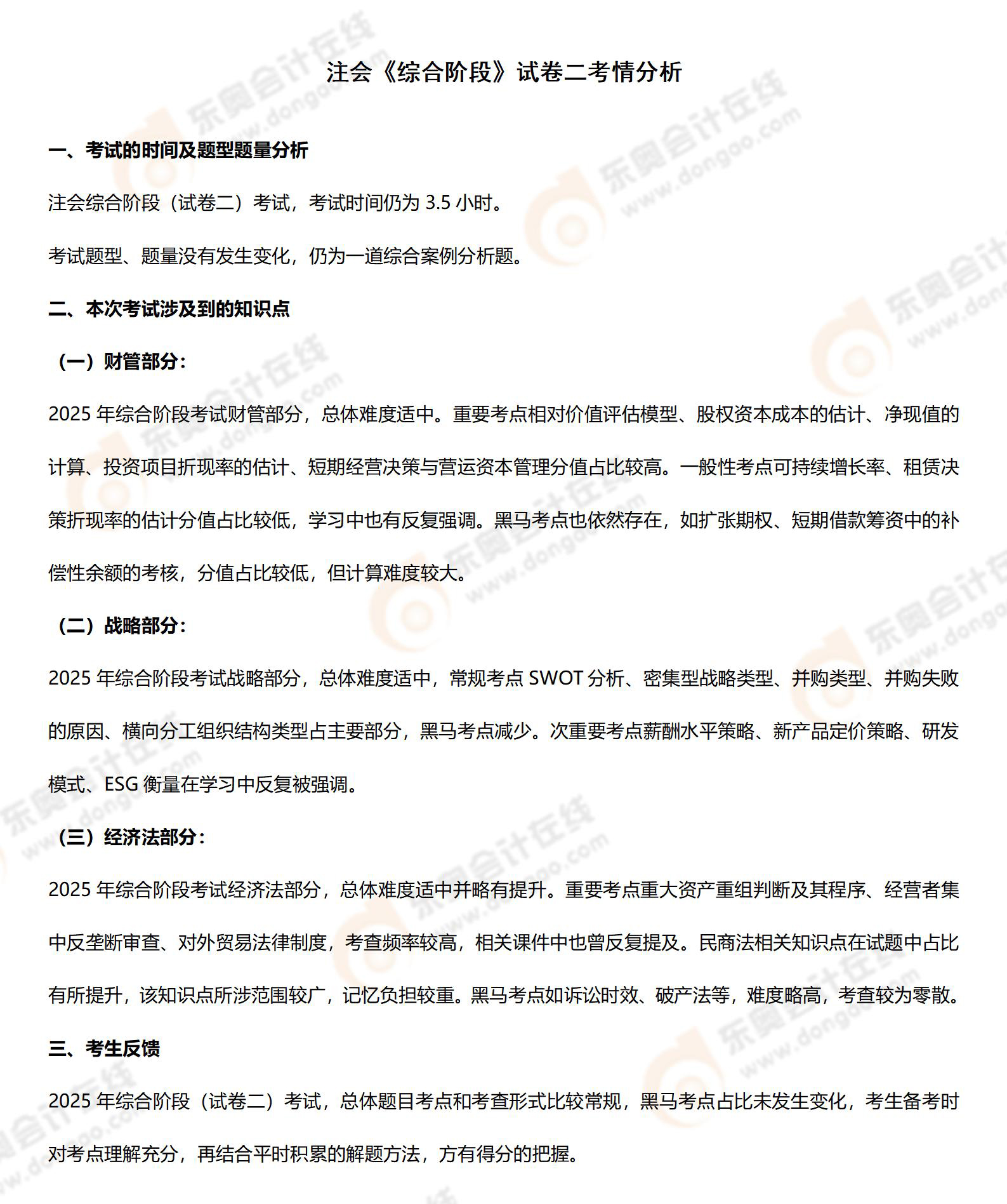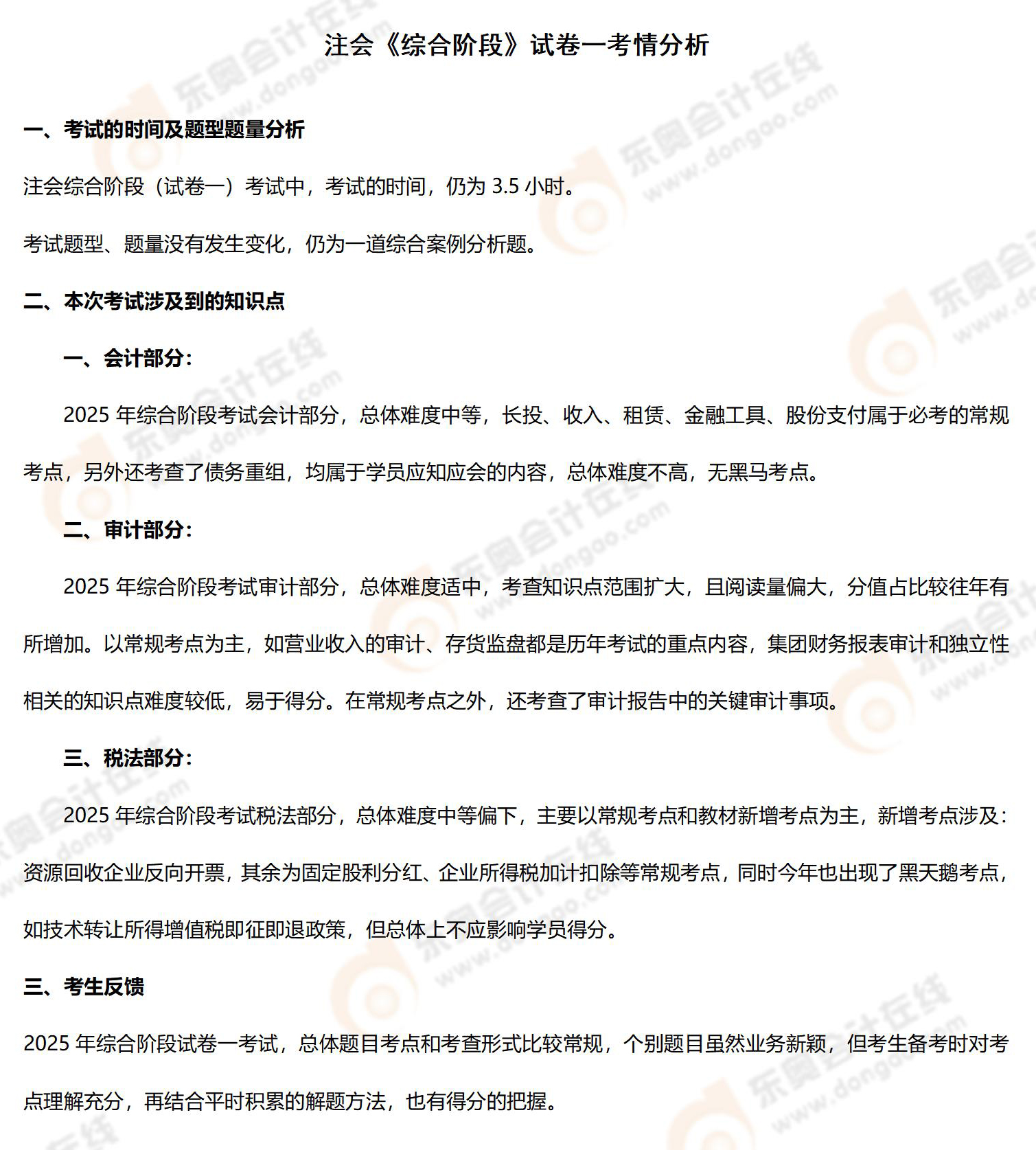 目前,2025年注冊會計(jì)師考試已經(jīng)結(jié)束,東奧教研團(tuán)隊(duì)根據(jù)考生回憶整理了綜合階段考試的考情和考點(diǎn)情況: