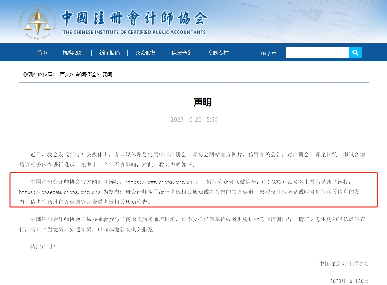 也是在近期,考生們注意到,中注協(xié)發(fā)表了《聲明》。聲明中強調:中國注冊會計師協(xié)會官方網(wǎng)站、微信公眾號、以及網(wǎng)上報名系統(tǒng)為發(fā)布注冊會計師全國統(tǒng)一考試相關通知或者公告的官方渠道,未授權其他網(wǎng)站或賬號進行相關信息的發(fā)布,請考生通過官方渠道登錄查看考試相關通知公告。