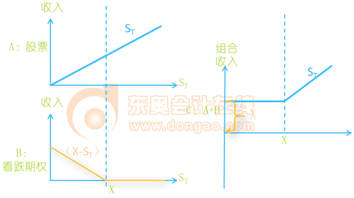 股票加看跌期權(quán)組合,稱為保護(hù)性看跌期權(quán)。是指購(gòu)買1份股票,同時(shí)購(gòu)買該股票1份看跌期權(quán)。